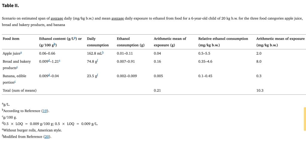 A következő táblázatban egy gyermek átlagos napi fogyasztását vették figyelembe a kutatók. Jól látszódik, hogy 10,3 mg etanol/ttkg mennyiséget is elérheti sima élelmiszerekből a gyermek napi bevitele. Ezt 6 éves gyermekre kalkulálták, de ezekből simán fogyaszt kisebb gyermek is.