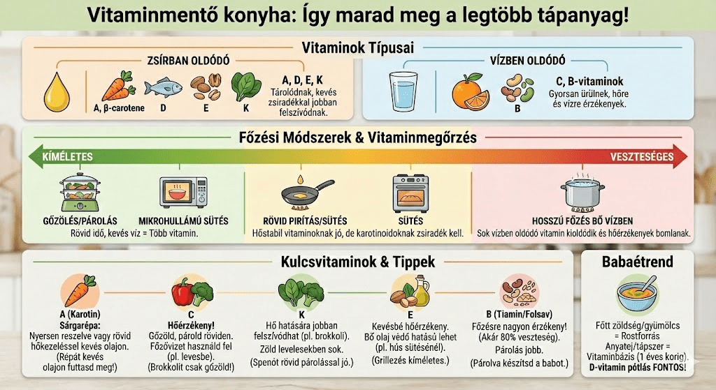 A grillezés, sütés, gőzölés, pirítás és mikrohullámú sütőben való sütés általában jobb, mert több vitamin marad meg, sőt a héj megtartása (amennyiben ez megoldható)is segítség lesz a vitaminbevitelben.